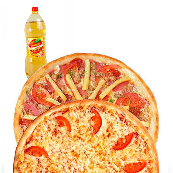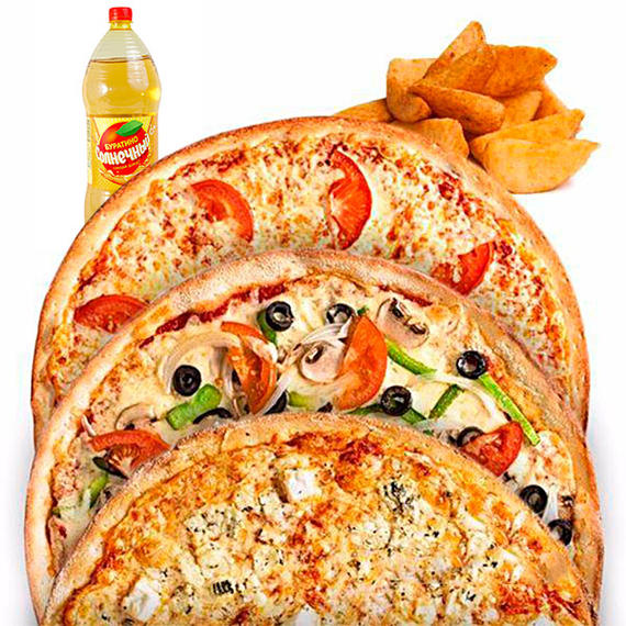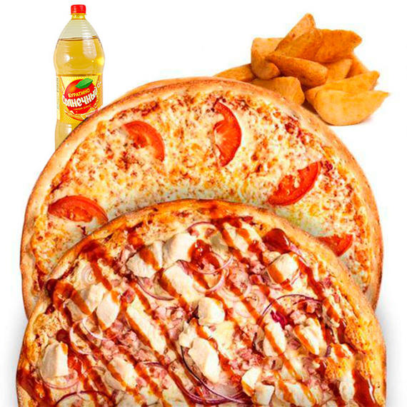 Пицца Маргарита, вторая пицца на выбор из цыпленок барбекю, сырный цыпленок или фермерская, картофель айдахо, напиток на выбор