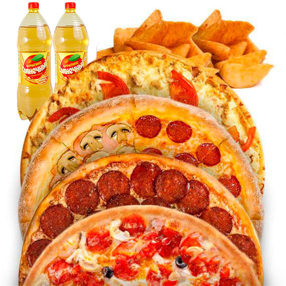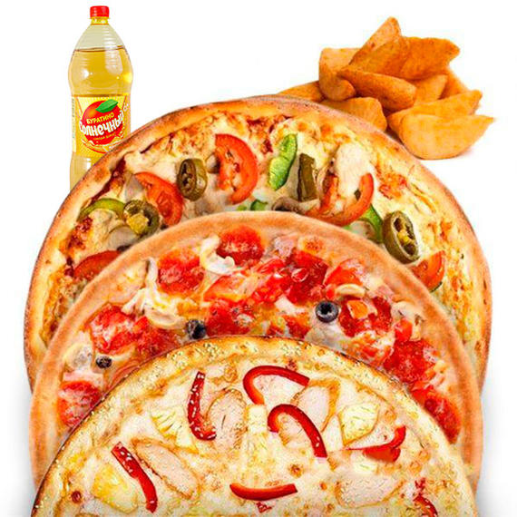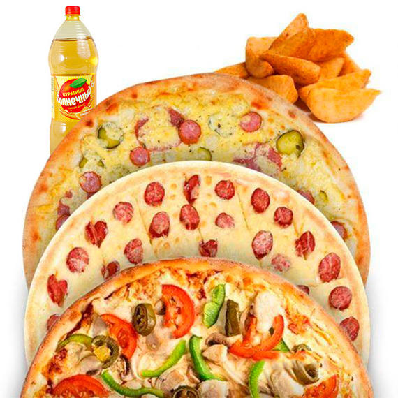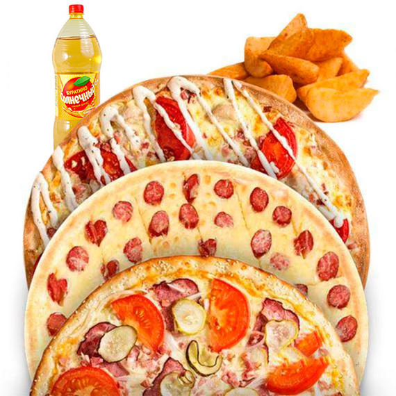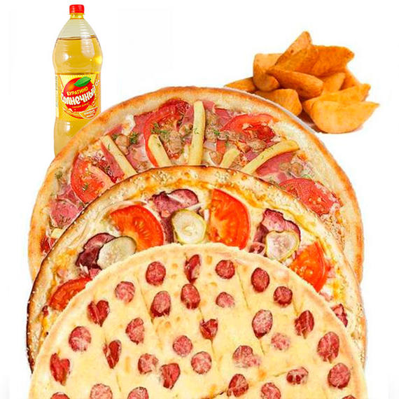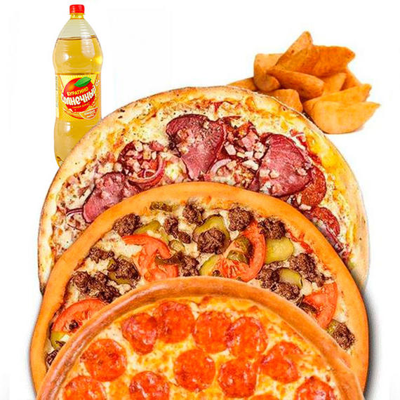 Сытный набор для компании. Салями (32 см), Мясная (32 см), Пицца с фаршем (32 см), Картофель айдахо, Напиток на выбор)