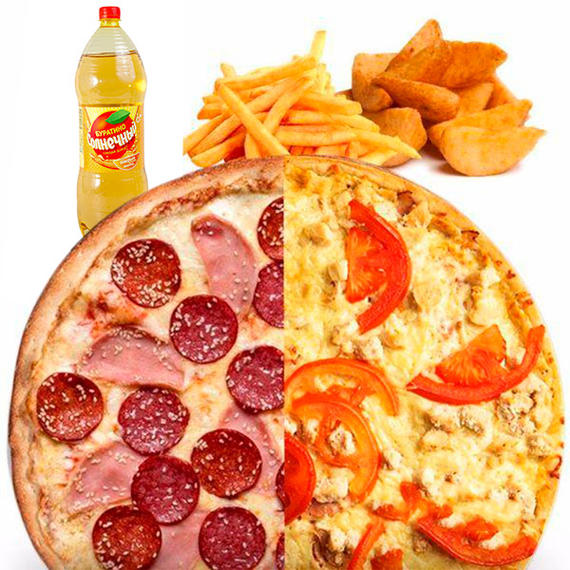 Прекрасный вариант для семейных посиделок. Большая пицца из 2-х половин: детская, сырный цыпленок, дарим картофель айдахо, картофель фри, напиток на выбор)