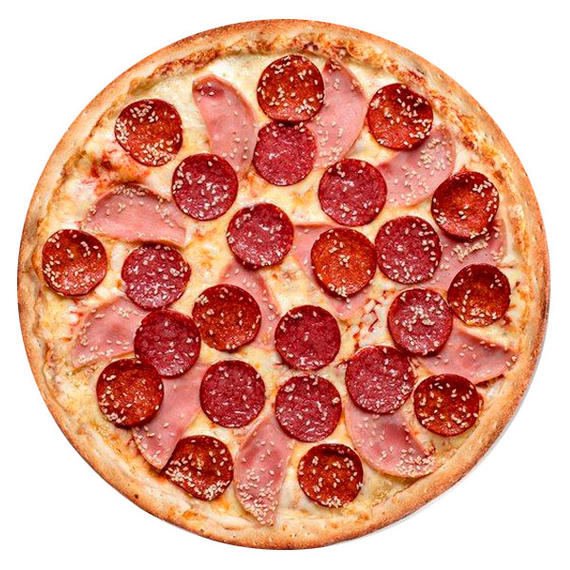 Томатный соус, ветчина говяжья, охотничьи колбаски, пепперони, салями, лук шалот, сыр моцарелла