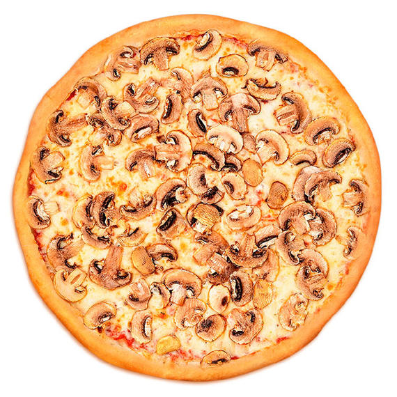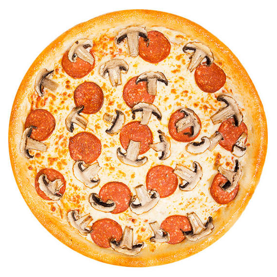 Томатный соус, колбаски салями, шампиньоны, сыр моцарелла.