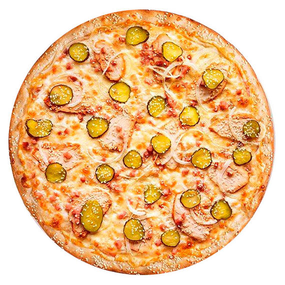 Томатный соус, говяжья ветчина, соленые огурцы, красный лук, томаты, сыр моцарелла