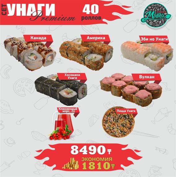 Канада 8 шт., Америка 8 шт., Эби но унаги 8 шт., Вулкан 8 шт., Хосомаки унаги 8 шт., пицца Унаги 30 см., морс клюквенный 2 л.