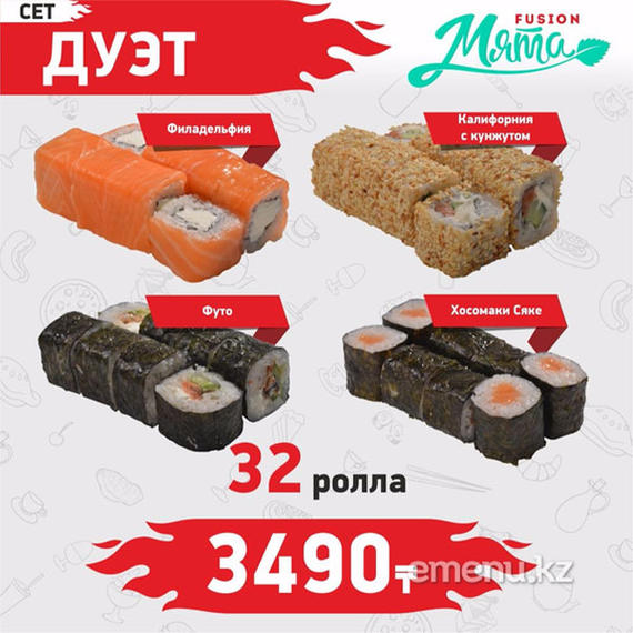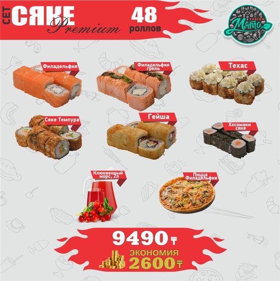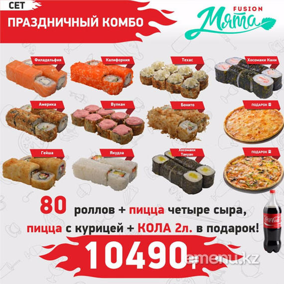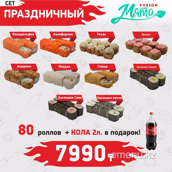 Филадельфия 8 шт., Калифорния классическая 8 шт., Техас 8 шт., Америка 8 шт., Вулкан 8 шт., Якудза 8 шт., Гейша 8 шт., Хосомаки сяке 8 шт., Хосомаки каппа 8 шт., Хосомаки такуан 8 шт. Coca-Cola 2 л. в подарок.