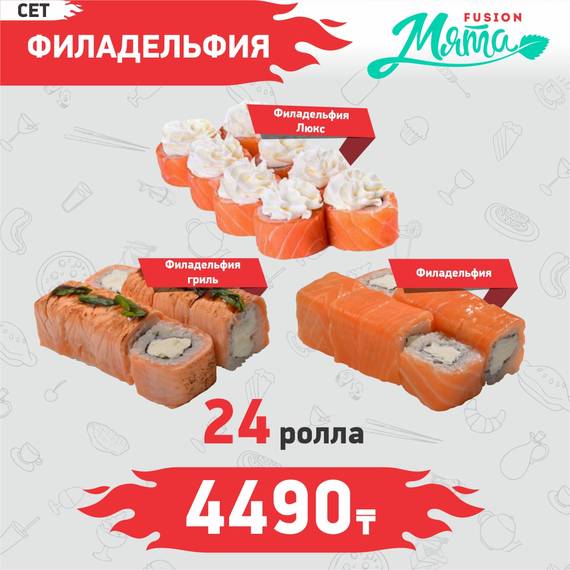 Филадельфия 8 шт., Филадельфия гриль 8 шт., Техас 8 шт., Гейша 8 шт., Сяке темпура 8 шт., Хосомаки сяке 8 шт., пицца Филадельфия 30 см., морс клюквенный 2 л.