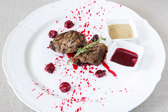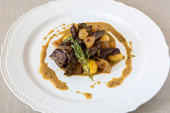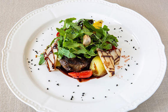 Сочный стейк из говядины с соусом на основе красного итальянского вина с добавлением меда и соуса «Демиглас», приправленный анисом и гвоздикой, подается с обжаренным молодым картофелем, помидорами черри и хрустящей рукколой
