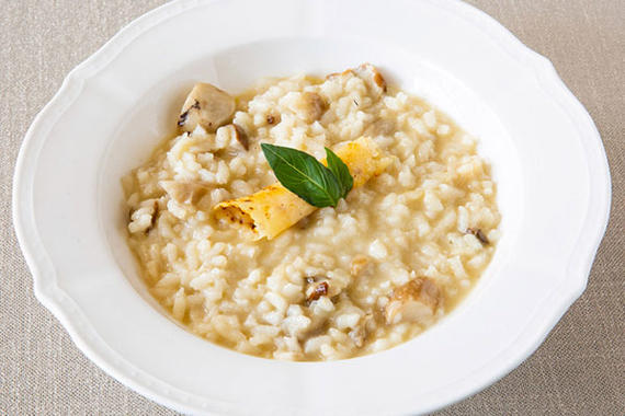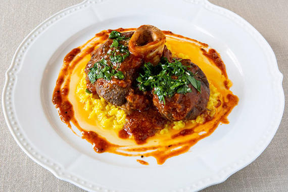 Томленая говяжья голяшка в томатном соусе с добавлением белого итальянского вина и прованских трав на подушке из ризотто с ароматом шафрана и свежей гремолатой