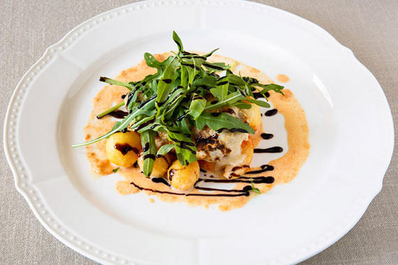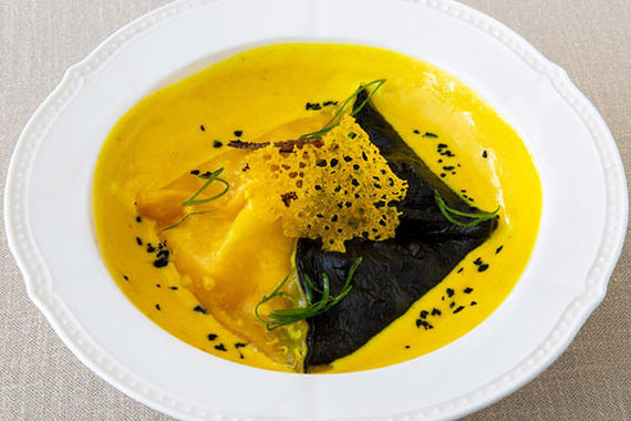 Равиоль с нежнейшим снежным крабом, тигровыми креветками и ароматным сыром в сливочном соусе с добавлением белого итальянского вина