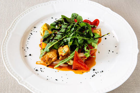 Куриная грудка, болгарский перец, цукини, помидоры черри, руккола, крем бальзамик