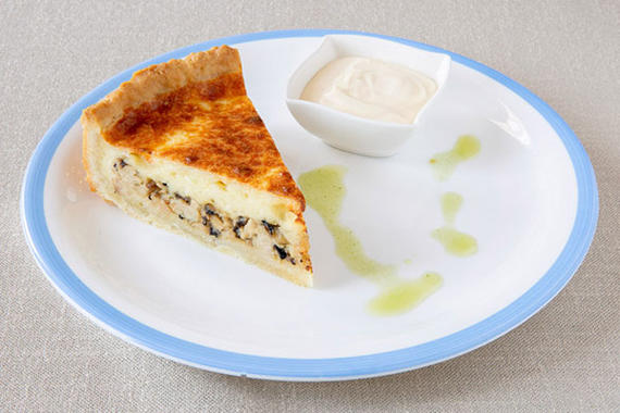 Открытый пирог с куриной грудкой, шампиньонами, сыром моцарелла и сливками