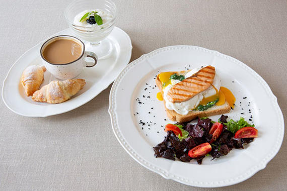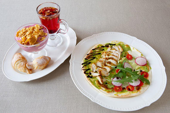 Домашний йогурт с кукурузными хлопьями, брускетта с соусом цезарь, грилованной куриной грудкой, салат айсберг, томаты черри. Подается с чаем Happy Forest и круасанами с творогом и шоколадом.