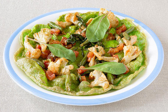 Обжаренная цветная капуста со стручковой фасолью и помидором, шпинат, соус песто