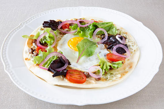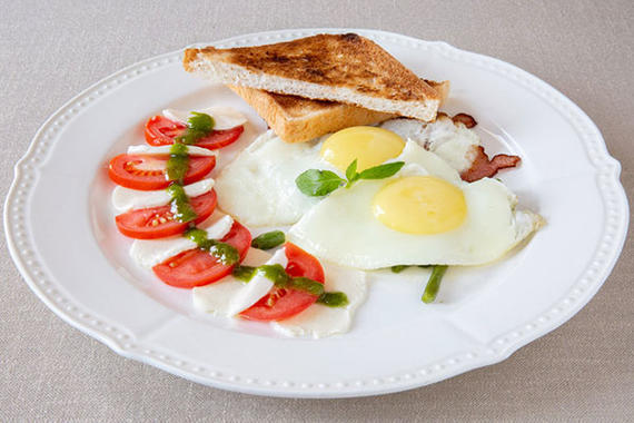 Обжаренная стручковая фасоль, обжаренный бекон или ветчина на выбор, глазунья, мини капрезе с песто