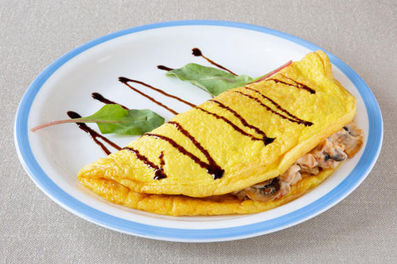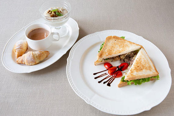 Каша овсяная с изюмом, грецким орехом и медом. Сендвич стейк – обжаренная говяжья вырезка, обжаренные шампиньоны, лук фри, лист салата, соус майонез – горчица. Подаются с какао и круасанами с творогом и шоколадом.