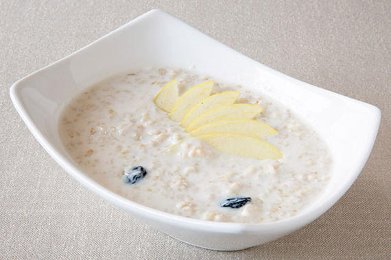 Овсянка, сваренная на молоке, с добавлением черного изюма и яблока, заправленная сливочным маслом и тростниковым сахаром