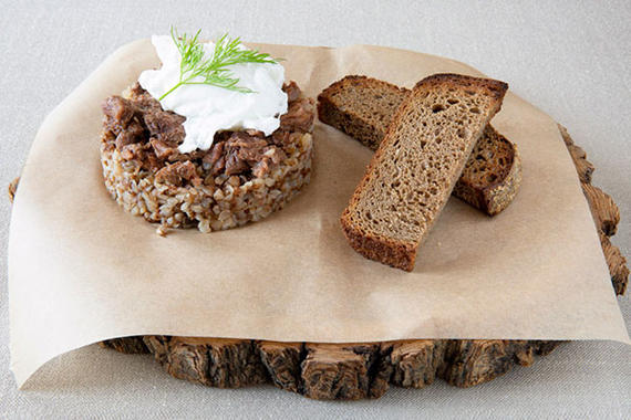 Томленная гречка с говяжьей тушенкой и сливочным маслом, подается с поджаренным бородинским хлебом и яйцом пашот