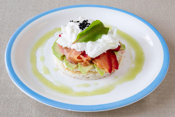 Тостерный хлеб, творожный сыр, семга, авокадо, яйцо пашот