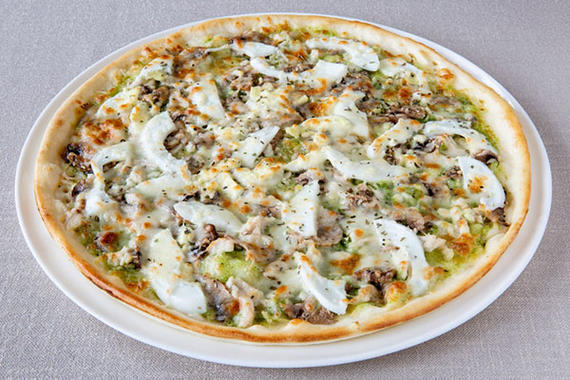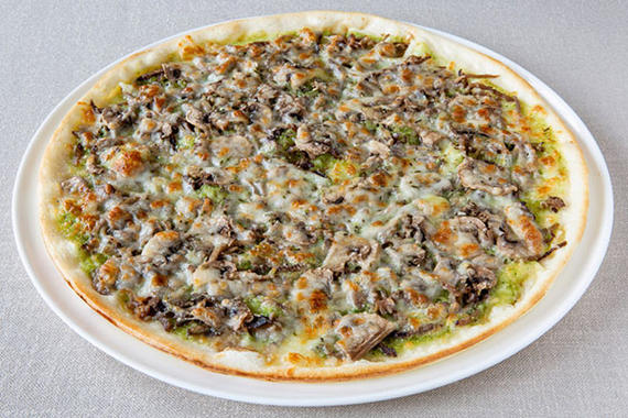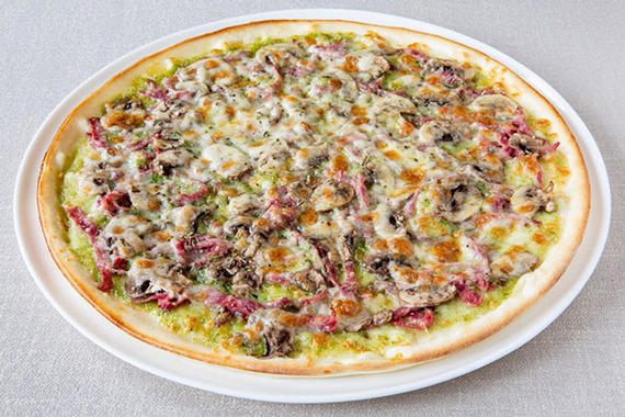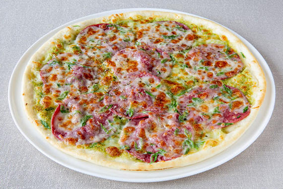 Соус Песто, ветчина, шампиньоны, сыр Моцарелла