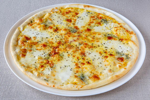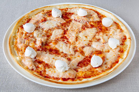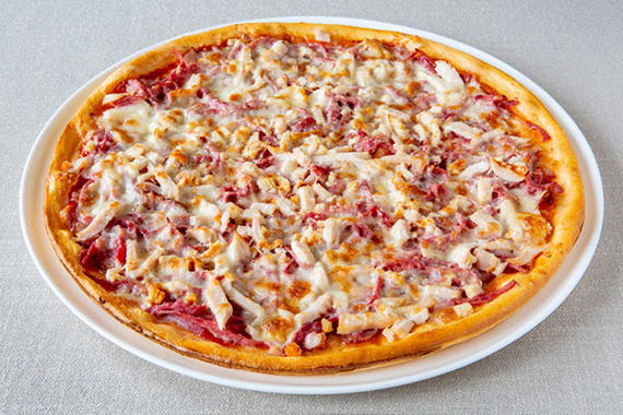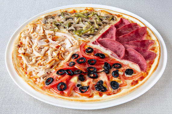 Пицца с фирменным томатным соусом и четырьмя вариантами начинки на равных секторах: 1. Копченая куриная грудка и сыр Моцарелла 2. Томаты, маслины и сыр Моцарелла 3. Говяжья ветчина и сыр Моцарелла 4. Шампиньоны, корнишоны и сыр Моцарелла
