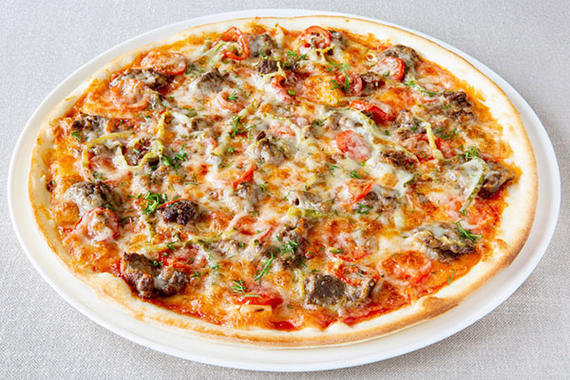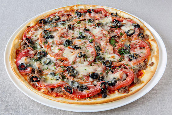Соус томатный, говяжий фарш, помидоры, маслины, сыр Моцарелла