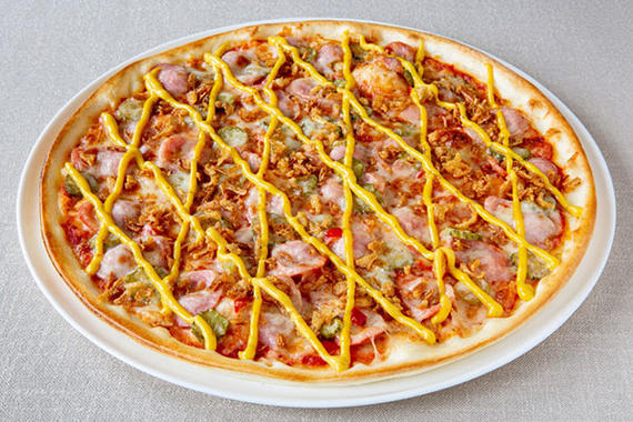 Соус томатный, горчичный соус, говяжьи сосиски, пепперони, корнишоны, лук жаренный, сыр моцарелла
