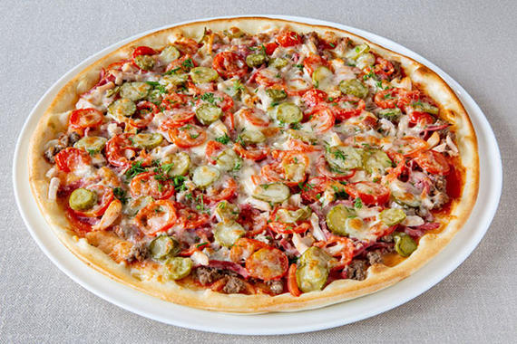 Соус томатный, ветчина, шампиньоны, оливки, маринованные огурцы, сыр Моцарелла