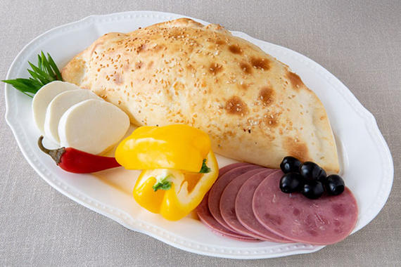 Соус томатный, ветчина, перчик пепперони, болгарский перец, маслины, лук зелёный, кунжут, Сыр моцарелла