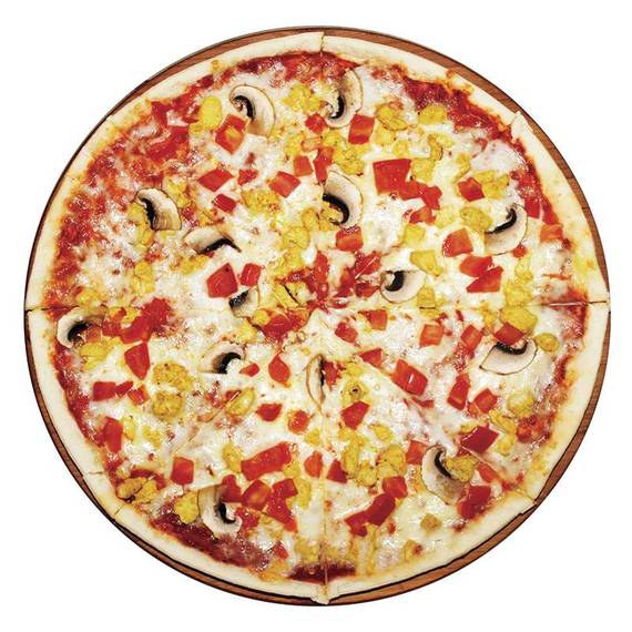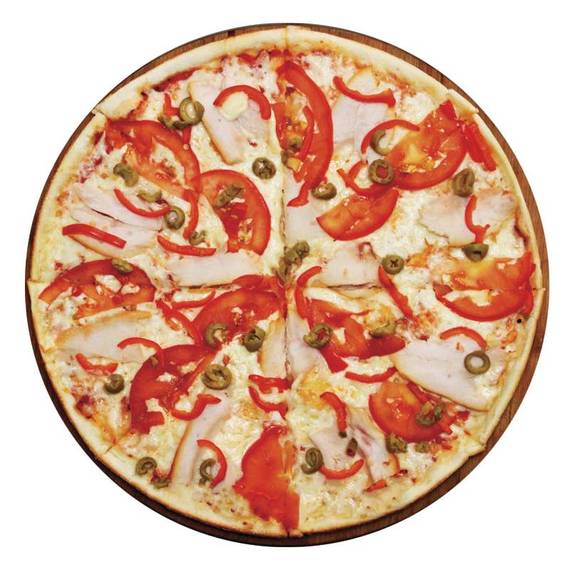 Томатный соус, сыр моцарелла, копченная курица, оливки, помидоры, болгарский перец.