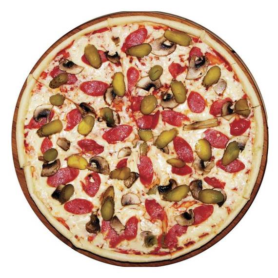 Соус барбекю, сыр моцарелла, охотничьи колбаски, грибы, маринованные огурчики.