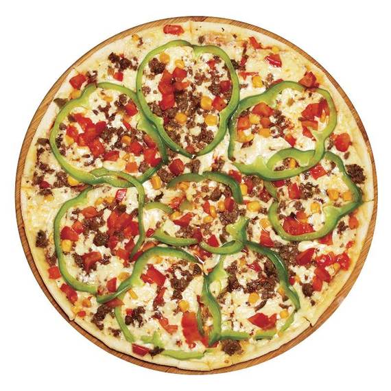 Томатный соус, сыр моцарелла, говяжий фарш, помидоры, болгарский перец, кукуруза, перчик халапеньо.