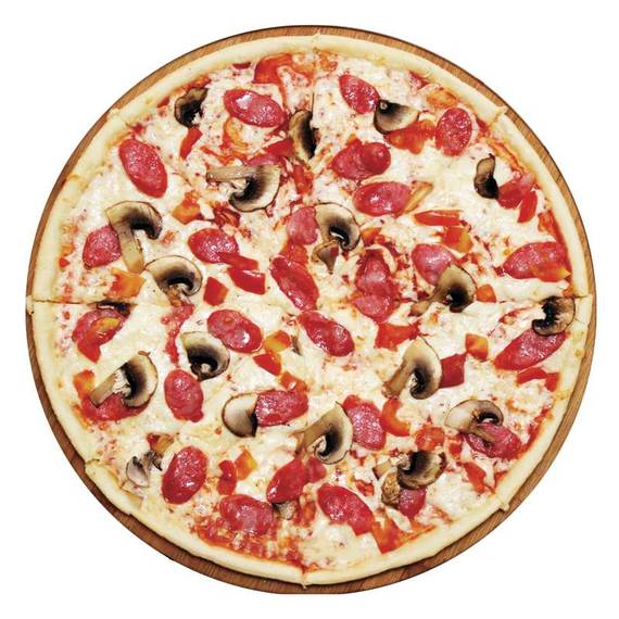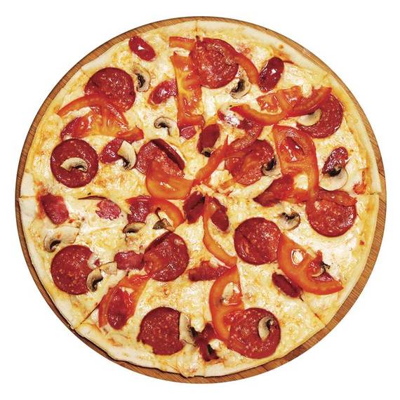 Томатный соус, сыр моцарелла, пепперони, охотничьи колбаски, грибы, помидоры.
