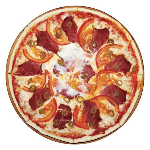 Томатный соус, сыр моцарелла, говяжий карбонат, помидоры, яйцо, оливки.