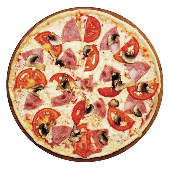 Томатный соус, сыр моцарелла, ветчина, грибы, лук, помидоры, чеснок.