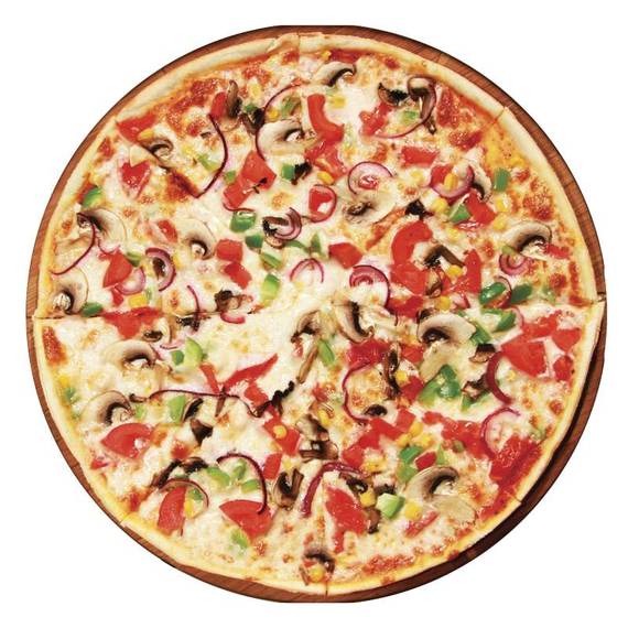 Томатный соус, сыр моцарелла, помидоры, перец болгарский, грибы, кукуруза, лук репчатый.
