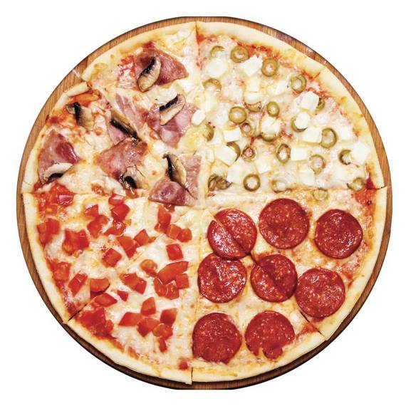 Томатный соус, сыр моцарелла, пепперони, сыр фетакса и оливки, помидоры, ветчина, грибы.
