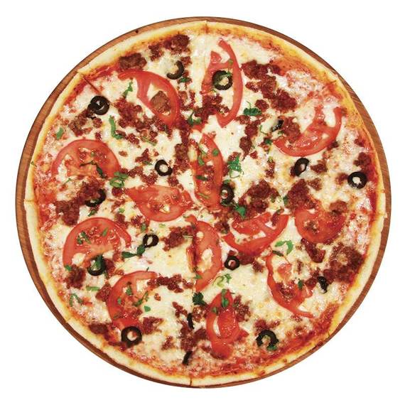 Томатный соус, сыр моцарелла, говяжий фарш, помидоры, маслины.
