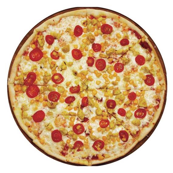 Томатный соус, сыр Моцарелла, помидорки черри, обжаренное куриное филе, кукуруза.