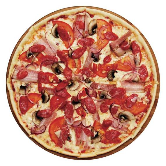 Томатный соус, сыр моцарелла, охотничьи колбаски, бекон, лук репчатый, грибы, помидоры.
