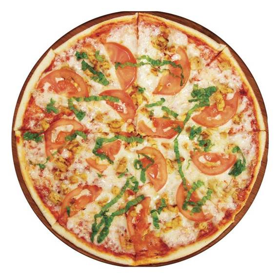Томатный соус, сыр Моцарелла, обжаренное куриное филе, помидоры, лук, перчик халапеньо, сухой чеснок.