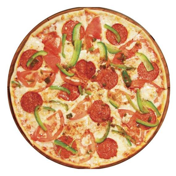 Томатный соус, сыр моцарелла, пепперони, помидоры, болгарский перец, перчик халапеньо, красный перец.