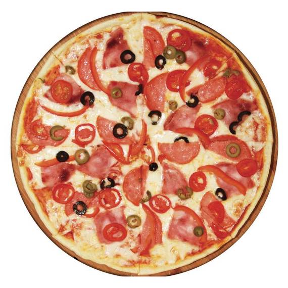 Томатный соус, сыр моцарелла, пепперони, ветчина, оливки, маслины, помидоры черри, болгарский перец.