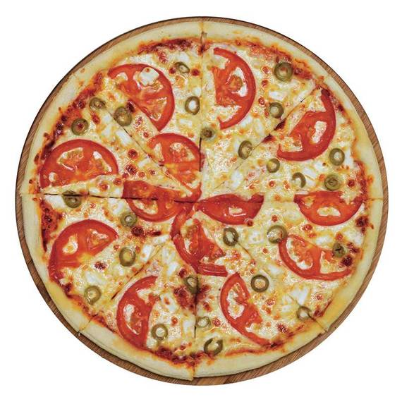Томатный соус, сыр моцарелла, помидоры, сыр фетакса, оливки.
