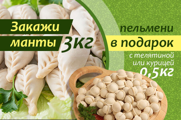 Закажи манты 3 кг и получи 0.5 кг пельменей с телятиной или курицей в подарок