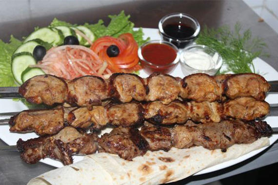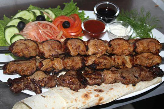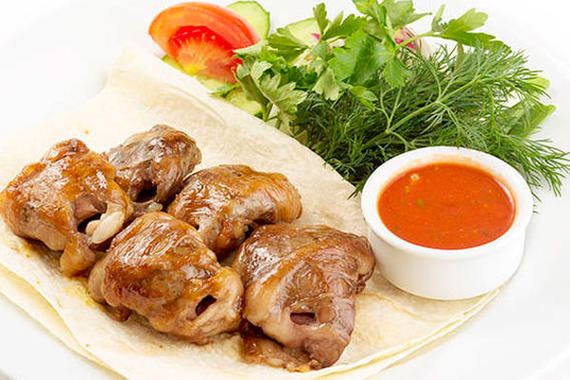 Телятина, курдюк, лаваш, маринованный лук, соус фирменный