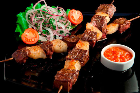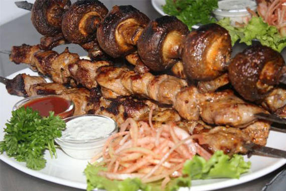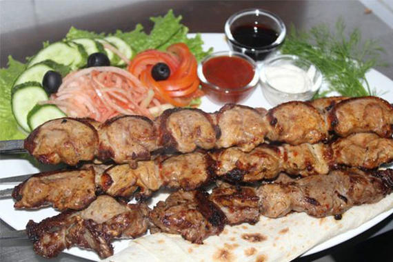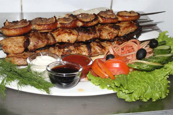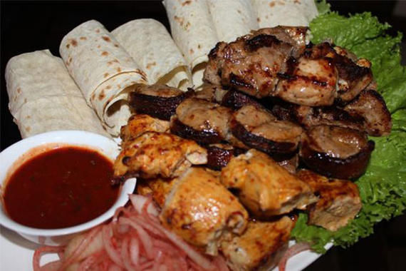 Печень, курдюк, лаваш, маринованный, лук, соус фирменный