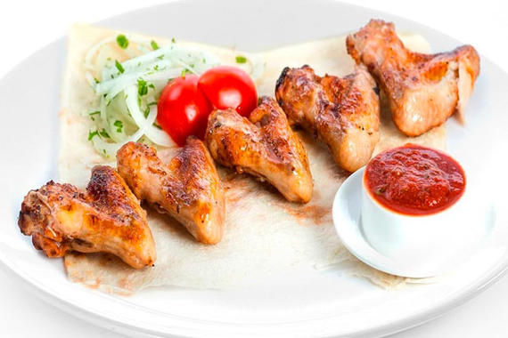 Крылышки, лаваш, маринованный лук, соус фирменный