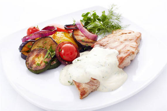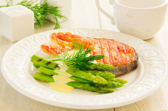 Семга на зеленой спарже с соусом из сливок и белого вина