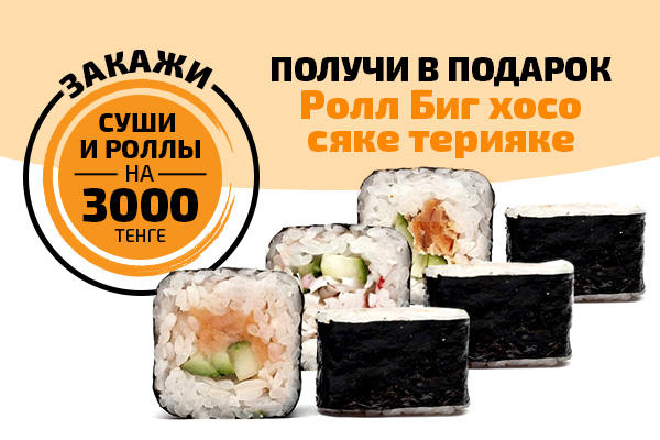 Оформи заказ от 3000 тг. и получи ролл биг хосо сяке терияки в подарок (Акция на сеты не распространяется)