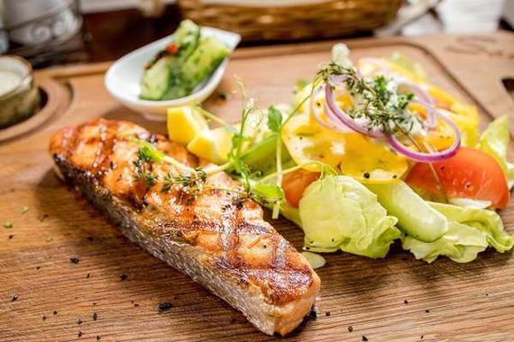 Стейк из семги жаренный на гриле, подается с соусом из каперсов, украшается долькой лимона