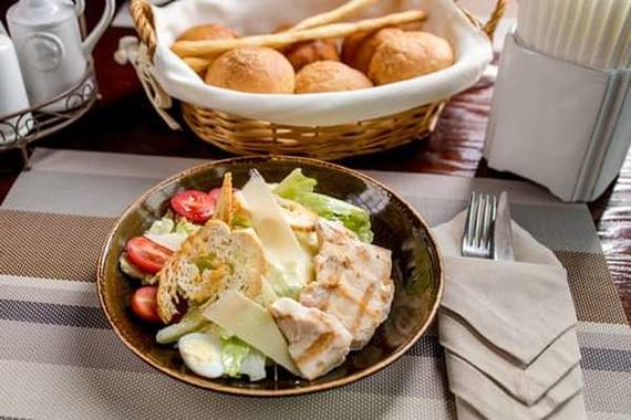 Салат айсберг, помидоры черри свежие, яйцо перепелиное, крутоны, сыр пармезан, заправляется соусом Цезарь